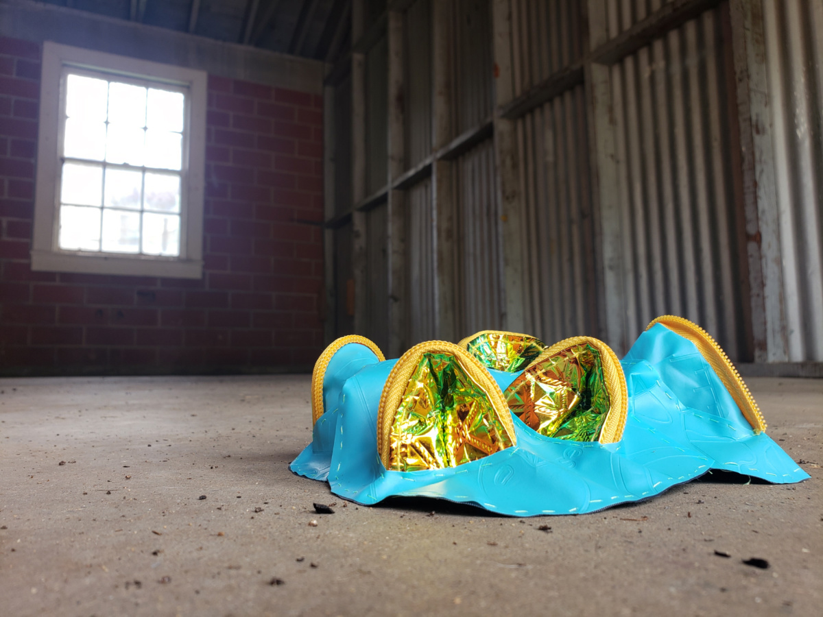 Image Statement: Reconfigured and assembled from a pineapple themed lunch box this sculpture was originally installed in the natural environment to represent human kind\'s over production clothing and home goods and the pollution from the textile industry. An future world where our trash becomes our environment.