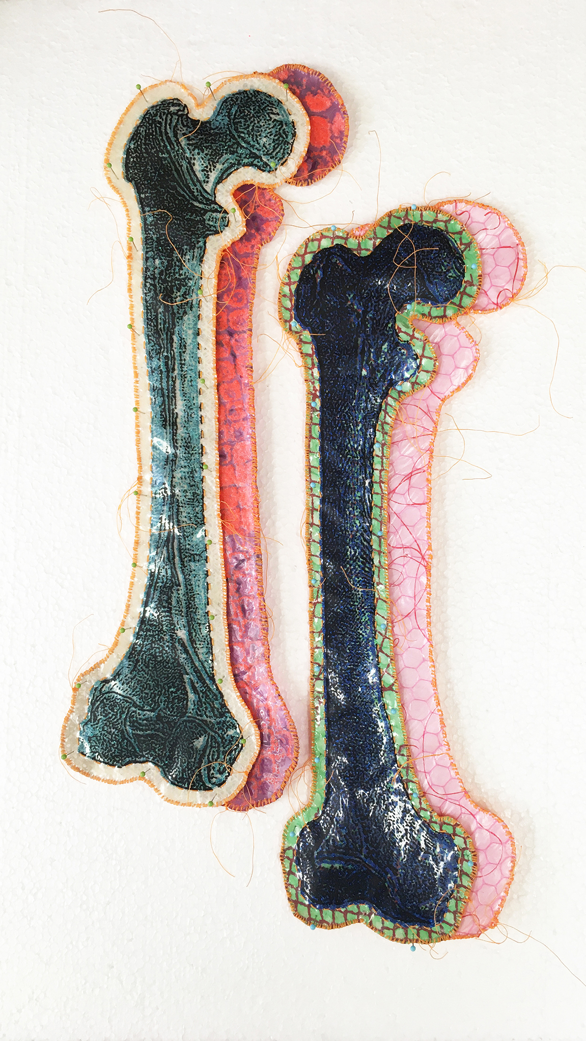 Materials: Hand sewn heat pressed plastics; embellished with screen-printing, glitter, pins and thread.