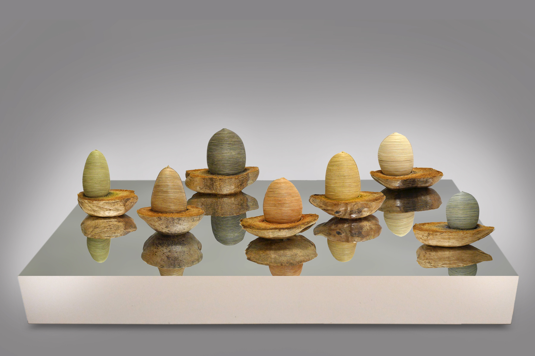 Image Statement: The egg shape is representative of all living things. The seven pods represent the seven continents. Each egg is encased in 30 to 40 feet of reed with the cane holding it in place. Stones were used for the form of the eggs. The weaving demonstrates how intertwined all species are with the coconuts showing the delicate balance there is in all life. Mylar was used to symbolize the oceans/water.