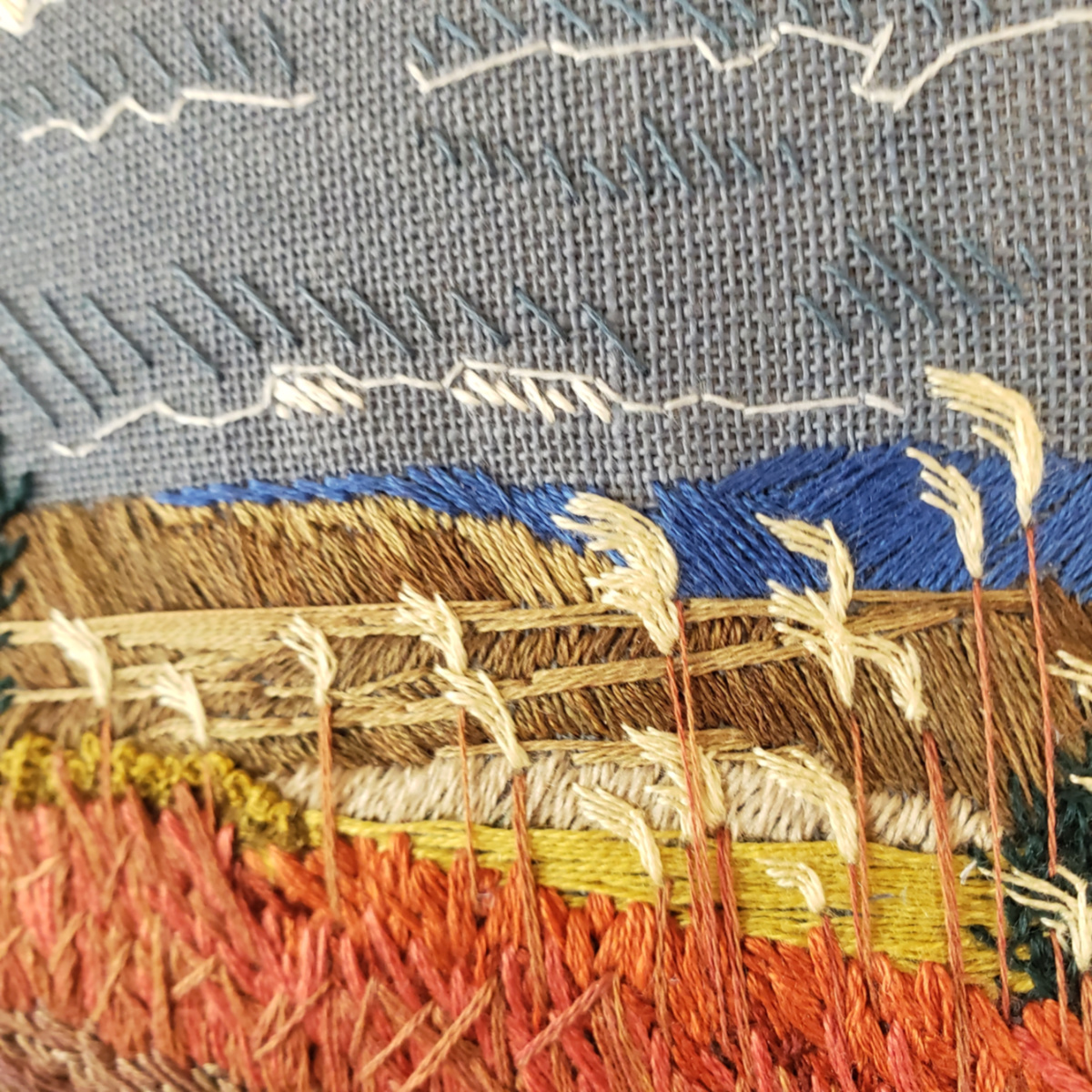 Image Statement: Gardens of Jentel Artist Residency overlooking Big Horn Mountains. Weight of threads and stitches are varied to convey depth.