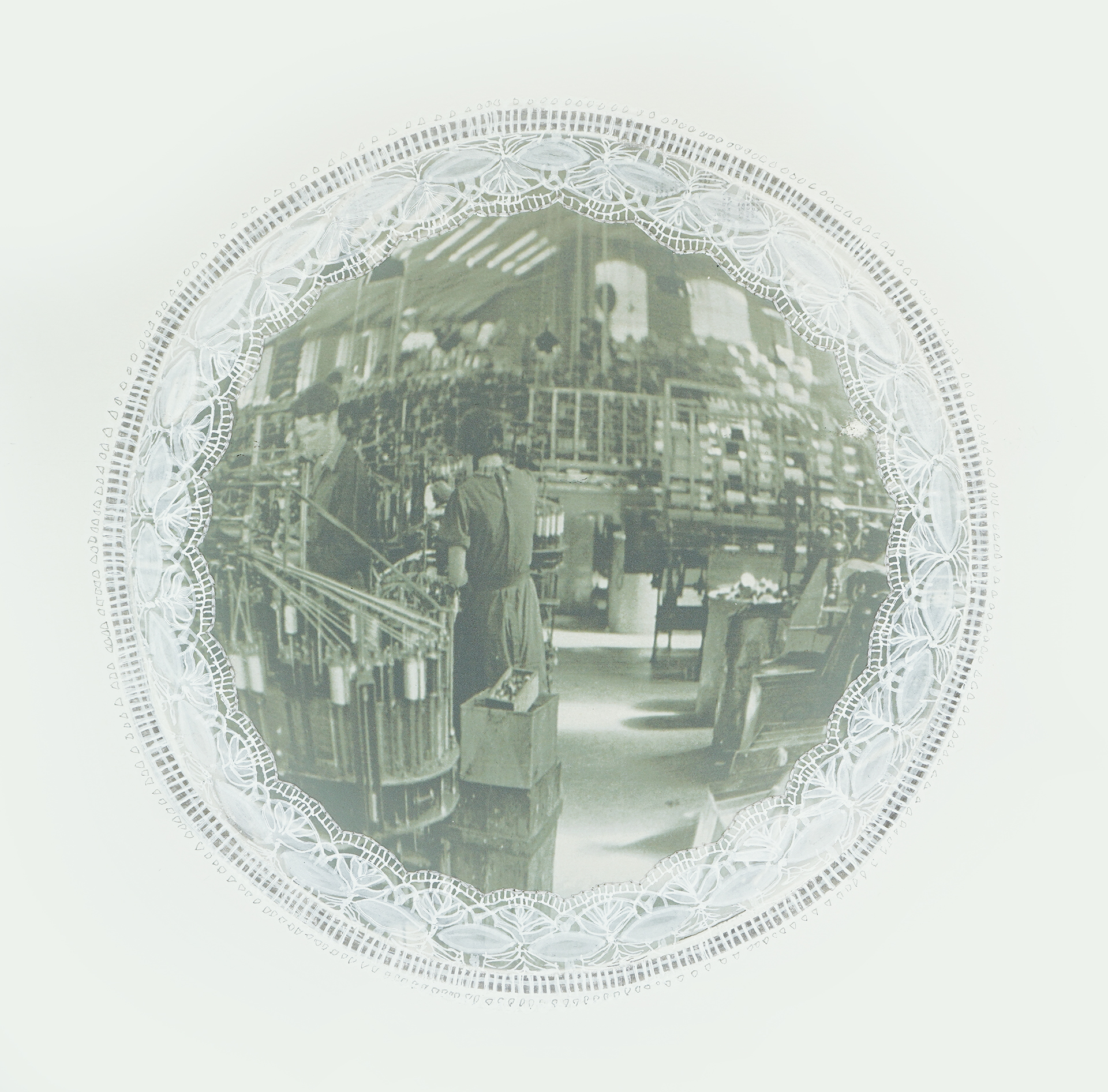 Image Statement: In this series, I have integrated historical photographs from the Tekstilindustreet Museum and patterns from the textile collection of the Osterøy Museum, creating an intersection between handwork and the textile industry. Transforming the photographs into a fish-eye lens perspective and printing them as archival pigment prints on paper transports the viewer back in time, honoring those who paved the way for the textile industry. In addition, I’ve added lace pattern borders sourced from the Osterøy’s collection that are drawn by hand and embellished with embroidery and beads, referencing the labor of handwork as a means of both love and survival, serving both the family and a means of trade. They were symbols of life at home and became skills that were passed down from generation to generation, yet through the industrial revolution and invention of machinery, these skills quickly transformed into a prominent way of earning a living. This series honors and recognizes this labor of love.