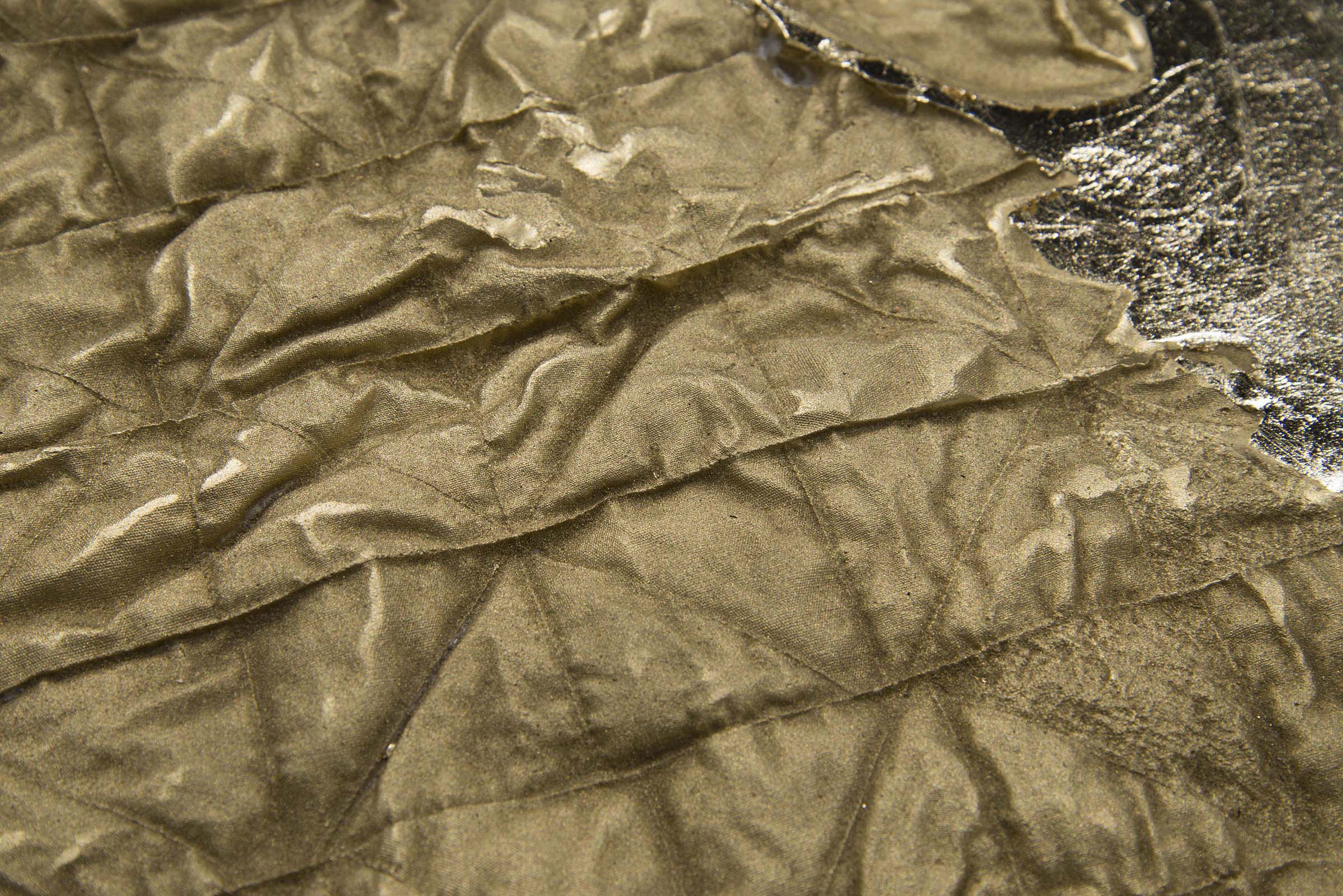 Materials: plaster, gold leaf, (indigo dyed cotton, madder dyed cotton, iron mordant, thread, cotton batting) Imprinted, embedded and faux gold leafed plaster blocks