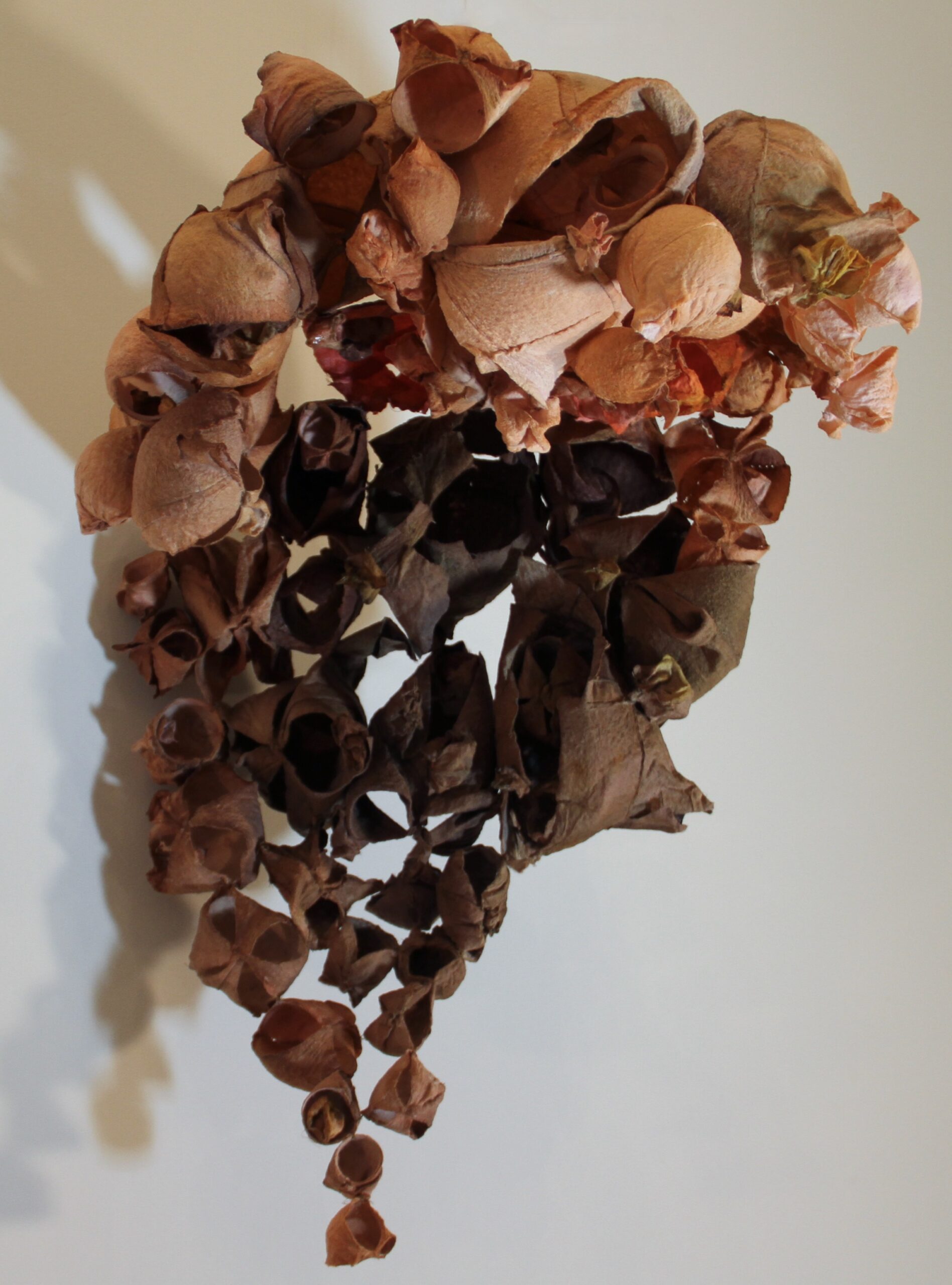 Image Statement: This work is about loss, created by hand dyeing, cutting, and forming varied individual vessels. Each vessel has been hand sewn, joining the larger mass that is hollow, and empty. Once vigorous, and bursting to overflow, it has been vacated and left behind to collapse under its own weight. Residue is formed from more than 90 separate non-woven fiber vessels, each with its own individual dye bath.