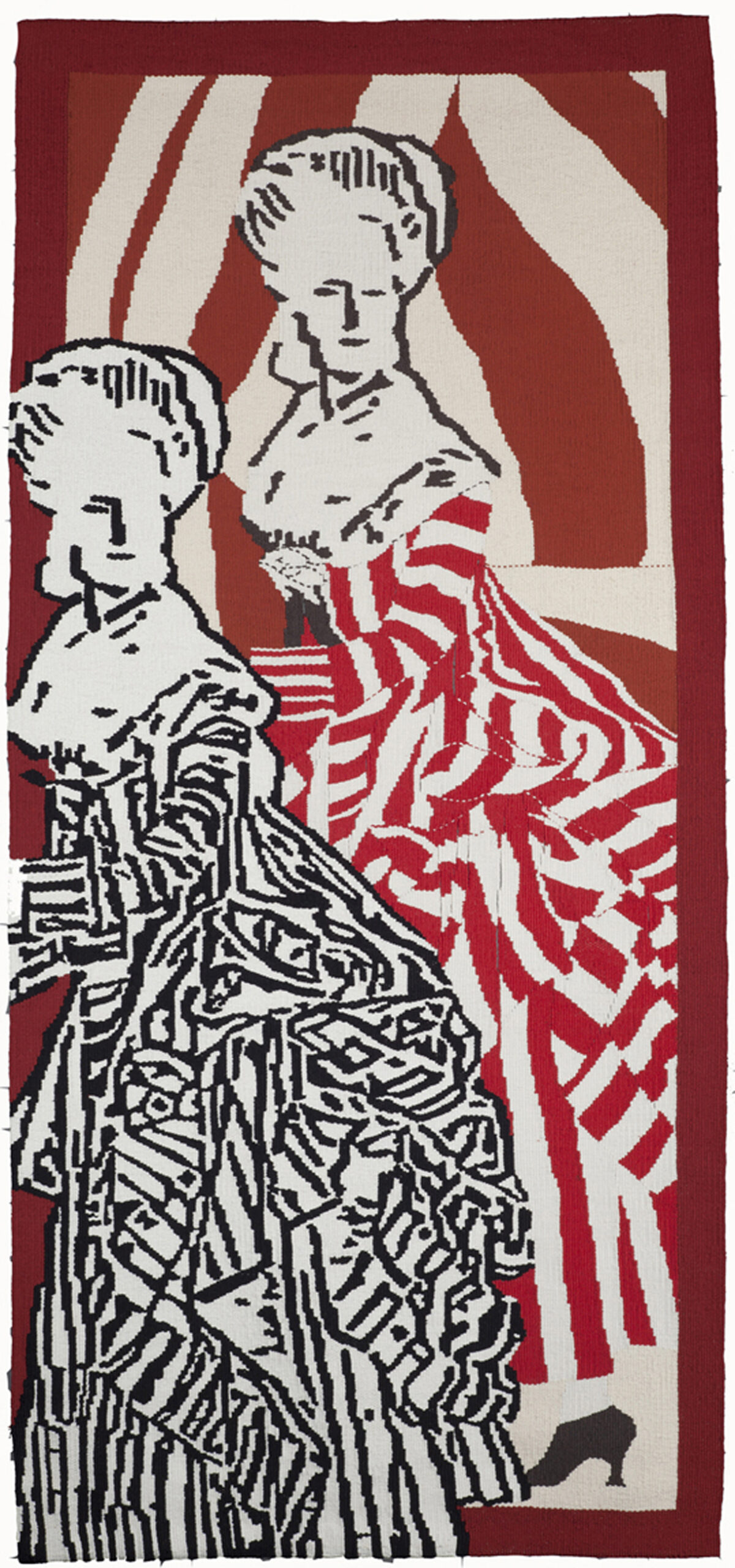 Image Statement: Revolution" was inspired by a c.1780, French, silk, walking dress, a new style derived from work clothes and town wear of ordinary people. In this new style, the skirt, draped back gave the wearer more freedom of movement. The folds and bright red color caught my eye."Revolution' speaks to the new freedom of the dress but also to the upcoming French Revolution and most importantly to the clothing evolution that would begin in ernest around 1850 with talk of how restrictive clothing distorted women's bodies and compromised their health. This was the start of the women's movement. Women tried to take back control of their bodies through clothing, later suffrage and on to today's issues. It won Best Traditional Tapestry from Atilje 61' 5th Triennial of Tapestry, in Novi Sad, Serbia