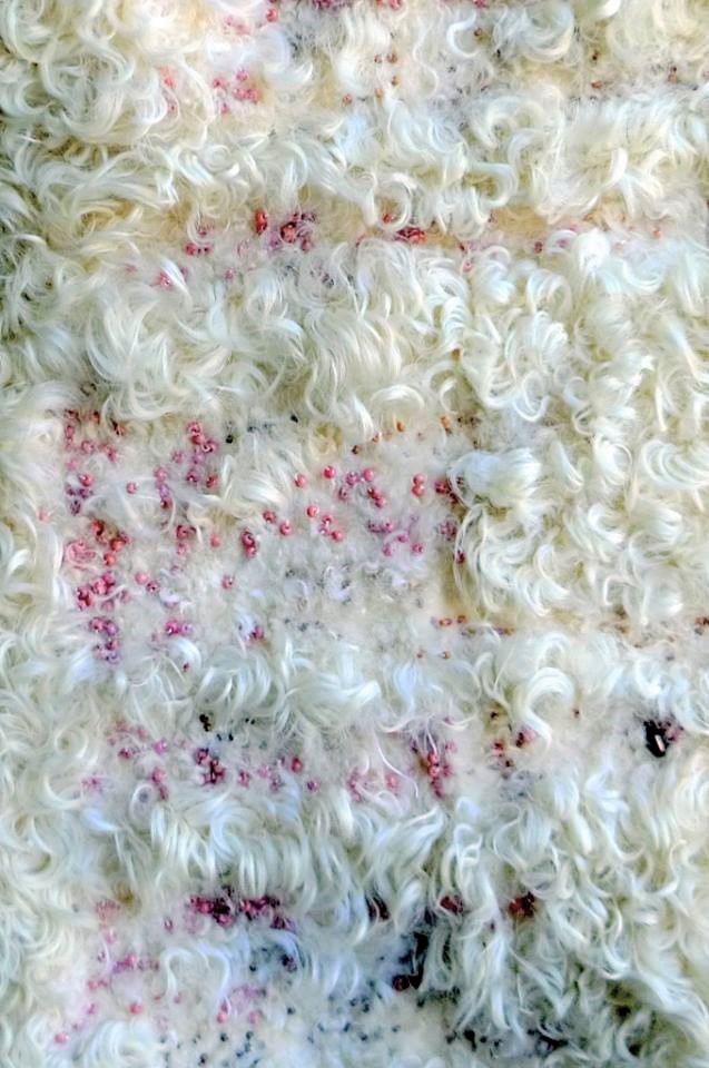 Image Statement: Showing a detail of the braille beadwork on scavenged sheepskin jacket positioned on the back of the rocking wolf. The braille text tells the story of Little Red Riding Hood.