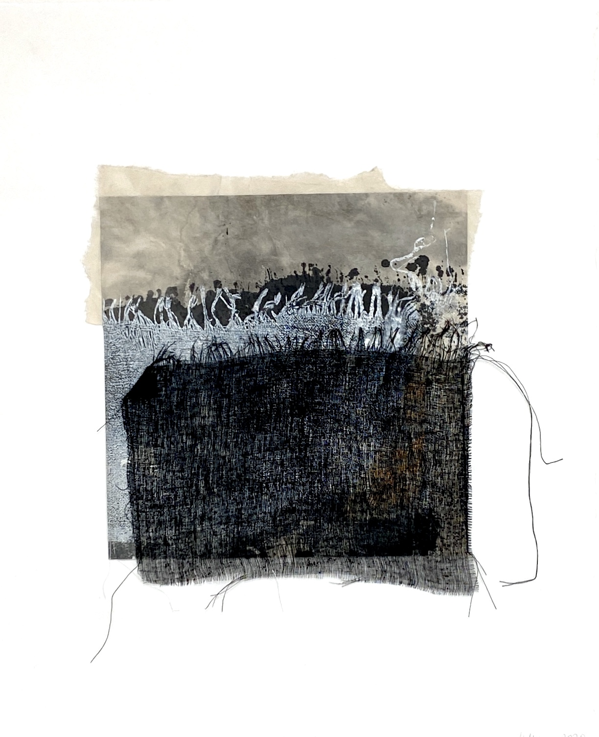 Materials: Monotype, textile fragment, sumi ink, washi paper, thread