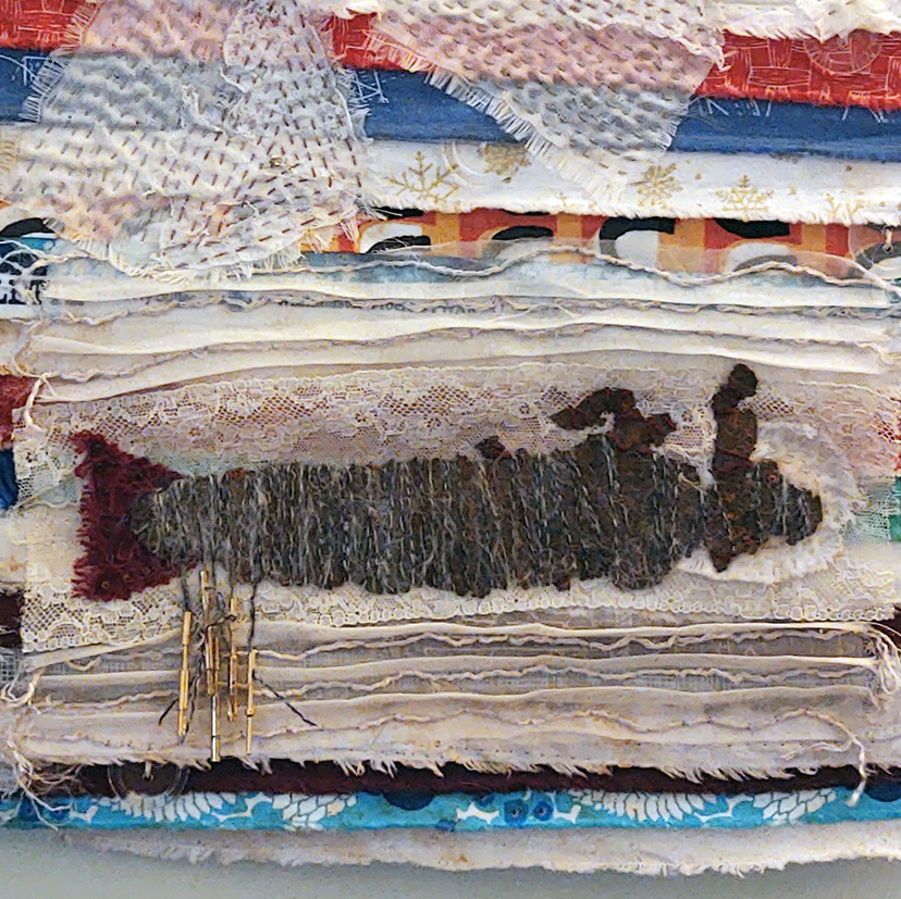 Materials: Cotton fabric, Mohair yarn, rusted metal.gold electronic parts,