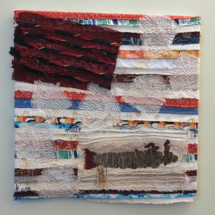 Materials: Cotton fabric, Mohair yarn, rusted metal.gold electronic parts,