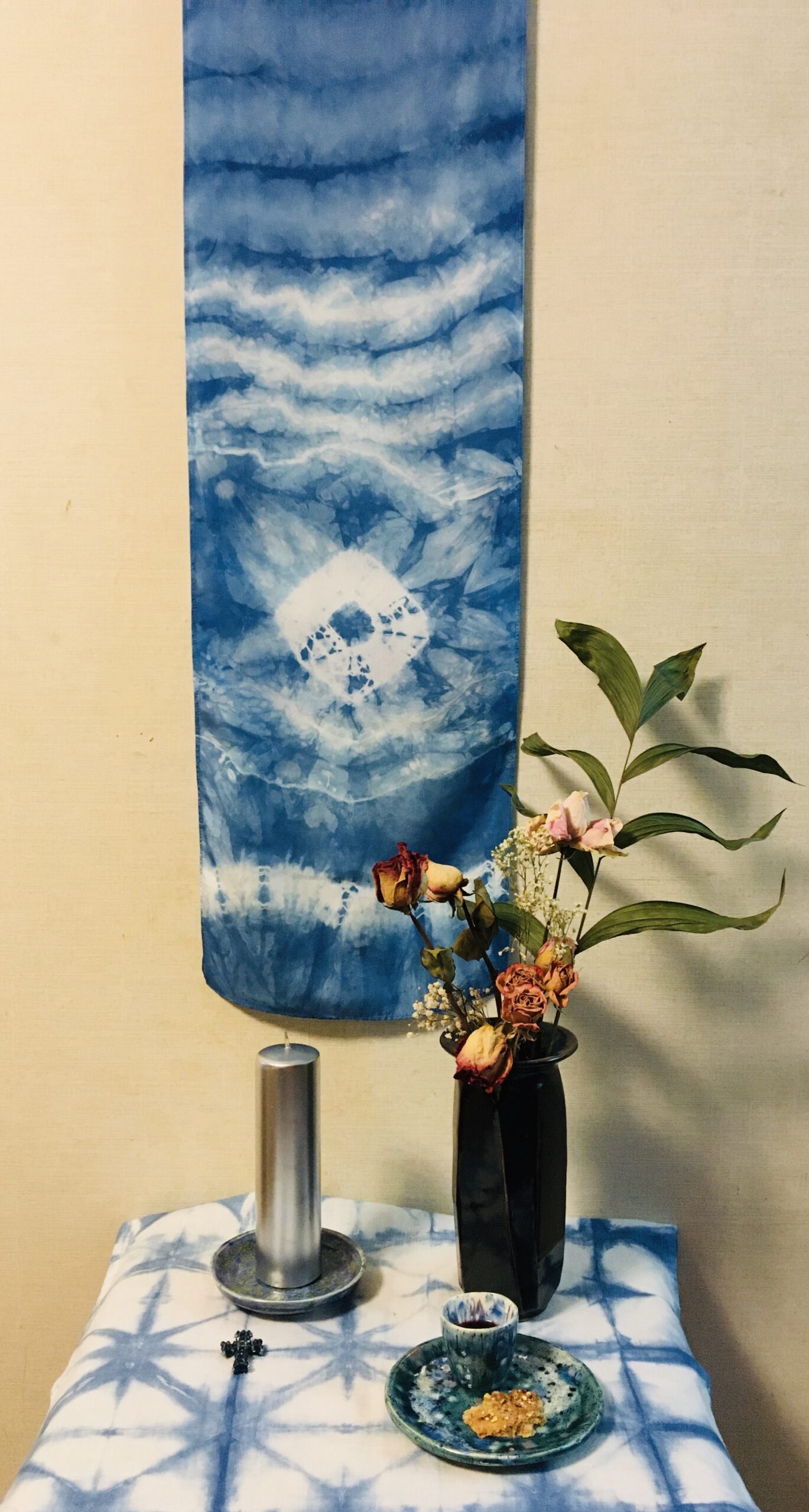 Image Statement: During the height of the pandemic in 2020, the minister of my church gave us the opportunity to create personal communion altars for our virtual services. It was a special time for me to bring my creativity and spirituality together with my textile art and handmade ceramics in these altars. This one includes a shibori indigo dyed scarf as a wall hanging.