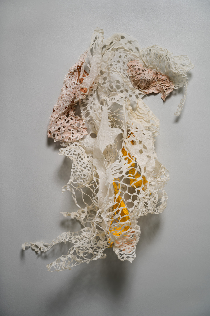 Materials: Artist made over beaten abaca paper, waxed linen, acrylic paint