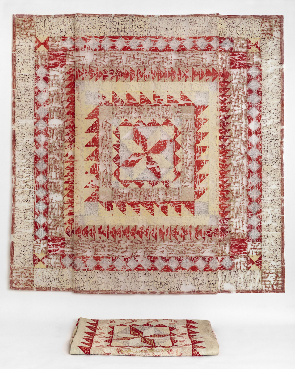 Image Statement: The work of many thousands of makers, both named and unknown, enable me to push the boundaries of work today. This is a copy of a traditional red and white quilt, re made in transparent fabrics patterned with paper lamination.