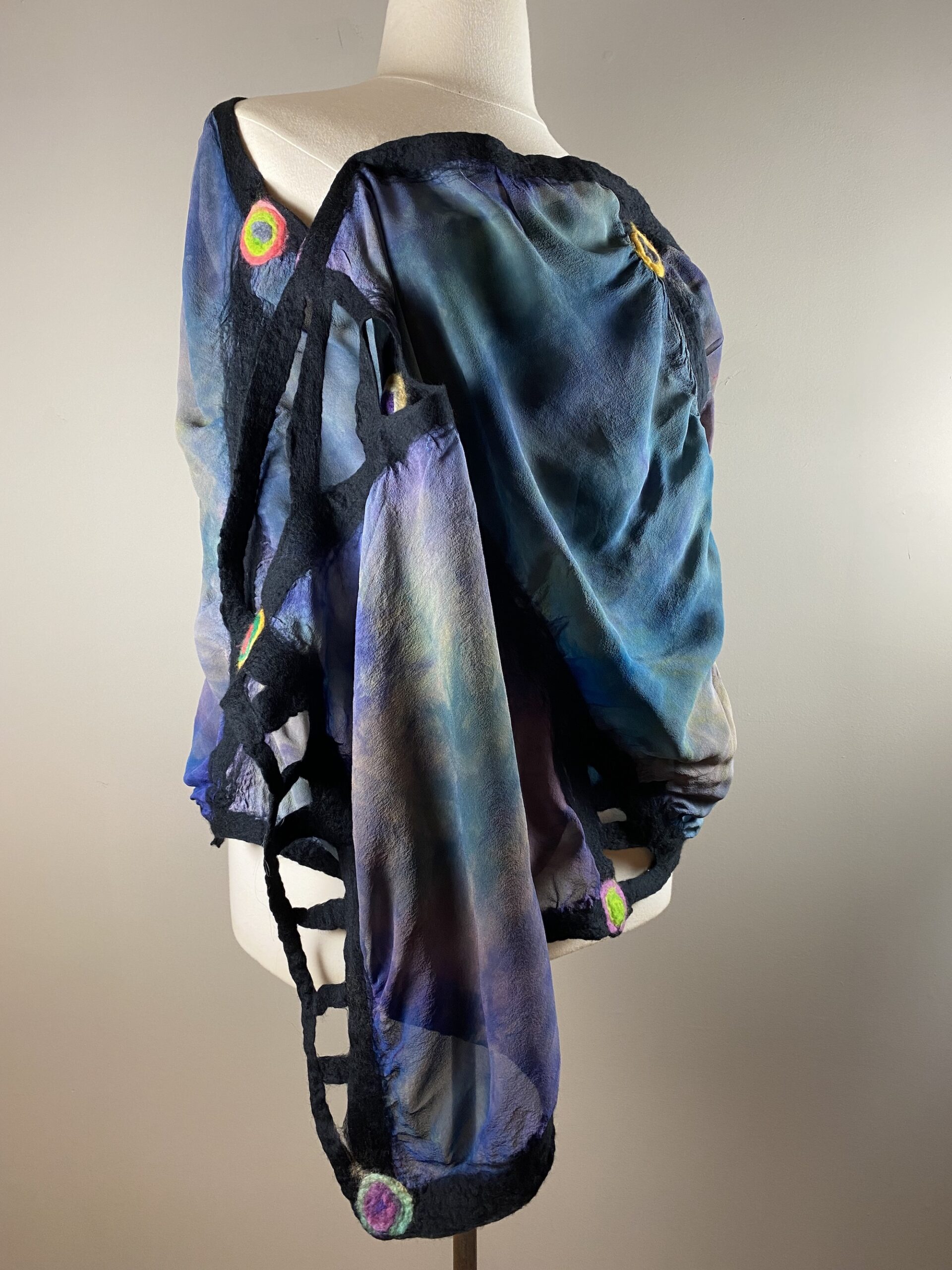 Materials: Hand dyed merino wool and silk Nuno felt.