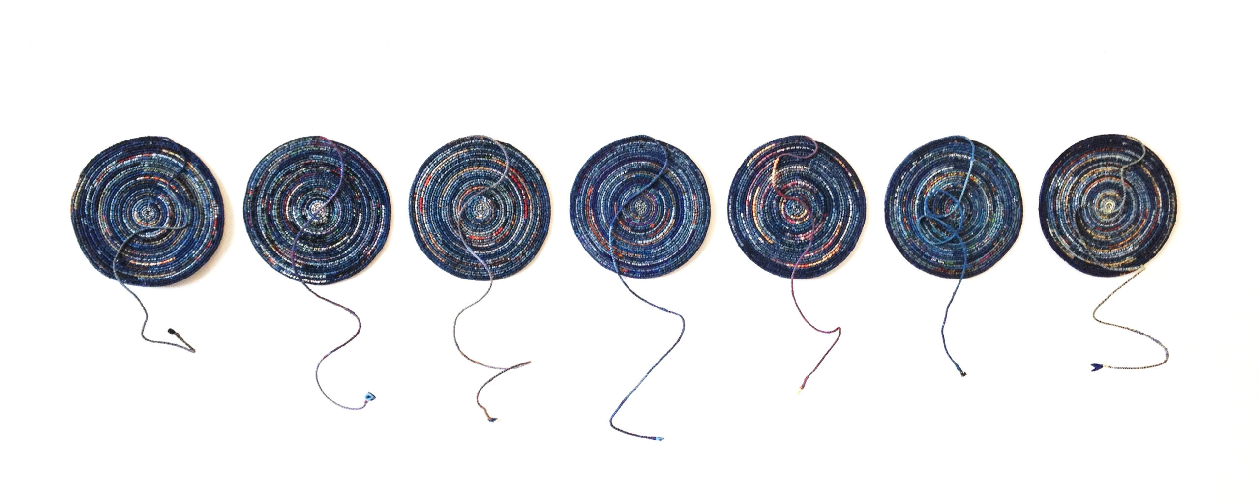Image Statement: I saved the test strips from 25 years of maintaining the indigo vats at SFSU. Testing Testing II displays seven coiled recycled indigo disks, each trailing its working element in a nod to technique. This installation speaks of the universality of indigo with each disk enlivened by bits of multi-colored fabrics from a part of the world where indigo has a presence. It also honors friendship through these scraps of colored cloth gleaned from the ragbags of willing friends from these places. Discarded textiles from Sweden, France, India, Indonesia, West Africa (Belgium), Japan and the US all came to me with family stories that enchanted me as I slowly wove them into a new life, honoring the past and reshaping the future.