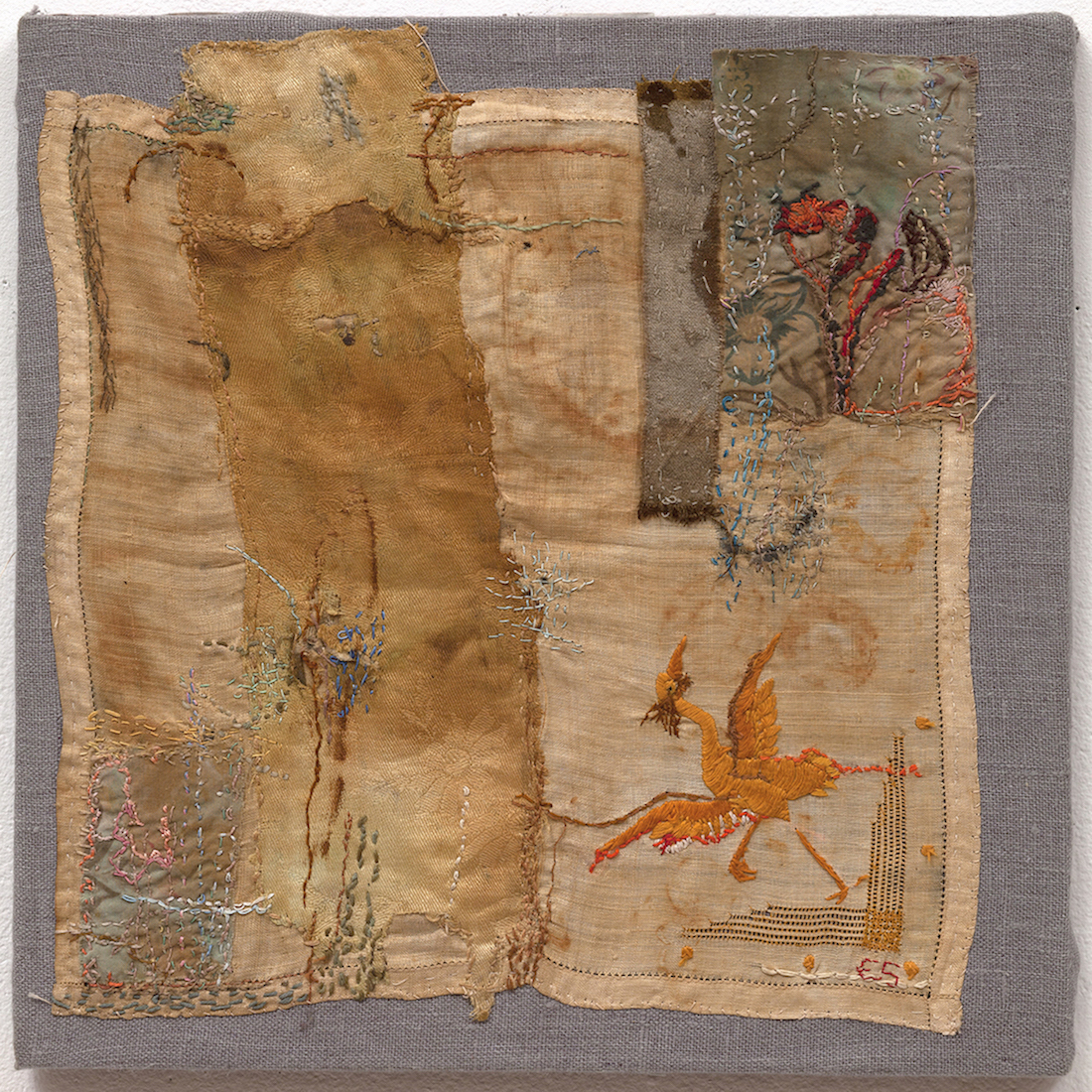 Materials: repurposed linen napkin, fabric remnants, hand-dyed and stitched