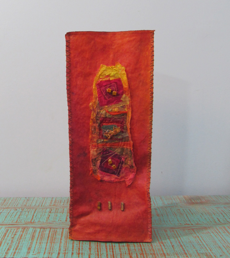Materials: Canvas, silk, Angelina fiber, painted Tyvek paper, beads, acrylic paint