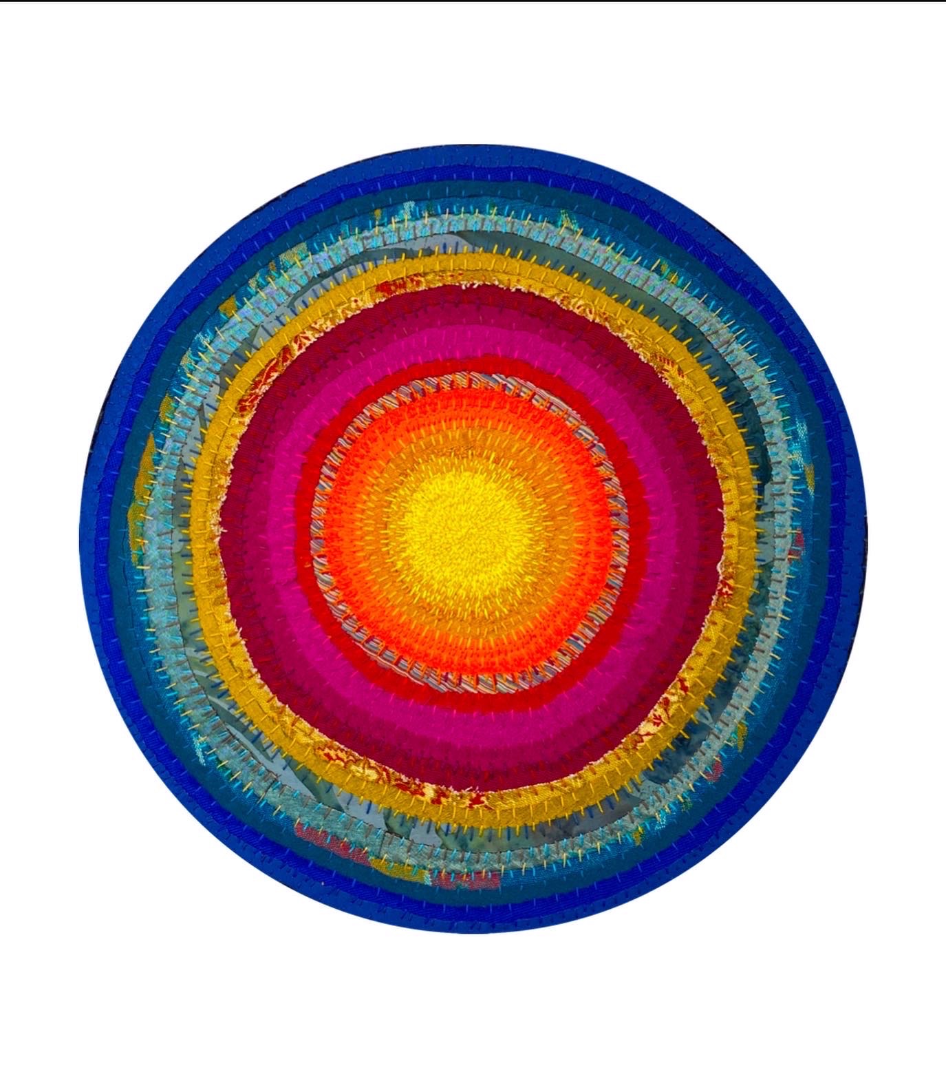 Image Statement: My portals are composed of layers of recycled and repurposed fabrics, mostly worn clothing. In this piece, I have reverse appliquéd 20 layers of fabric, cutting open each stitched layer to reveal the layer underneath.
