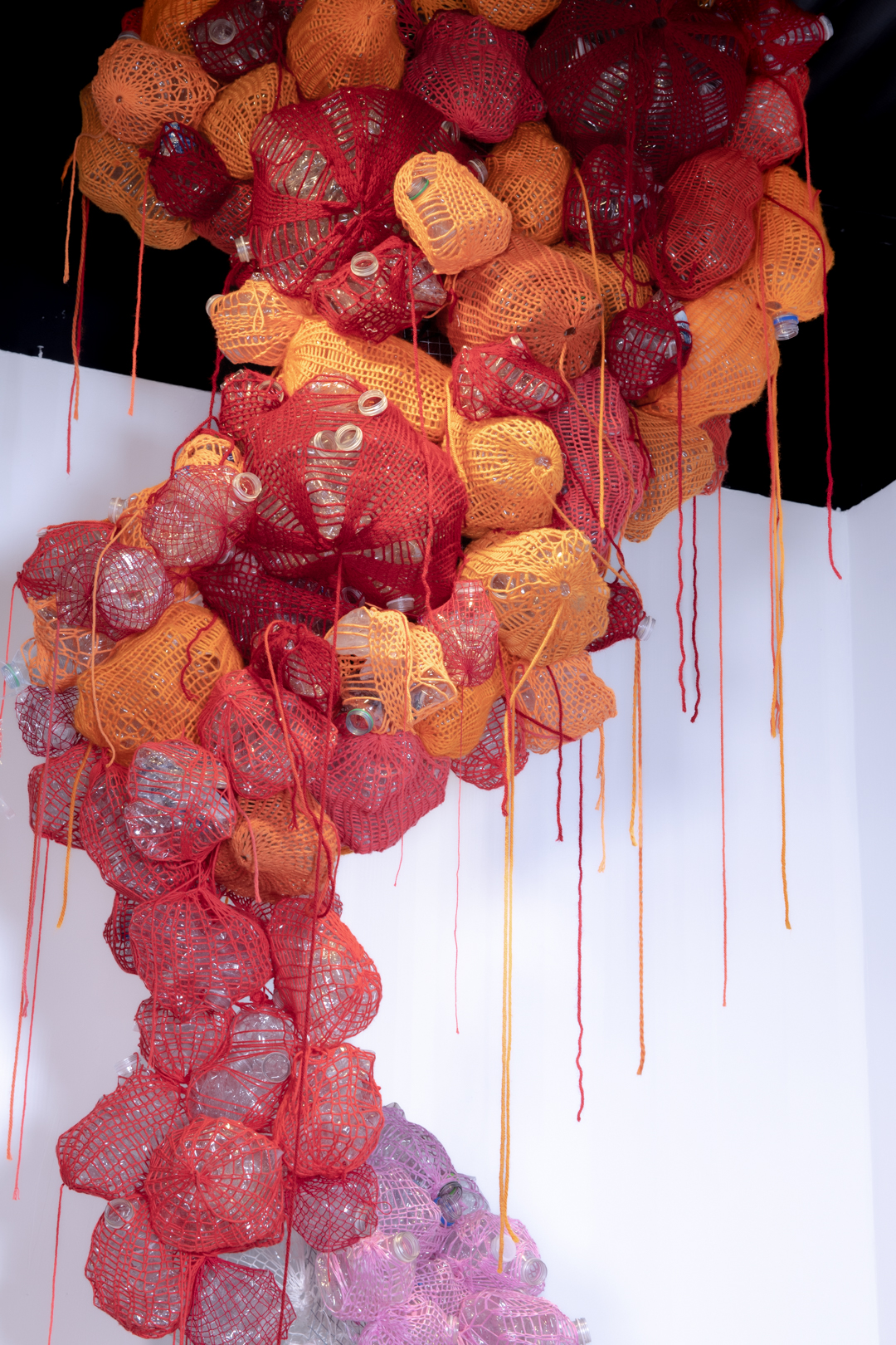 Image Statement: This body of work, “Thirst,” was inspired by witnessing construction crews consuming and disposing of thousands of plastic water bottles. By incorporating this plastic, which would otherwise be abandoned, I became interested in data mapping my consumption. The single-use plastic in my art represents nostalgia, memory, and the passage of time, creating complex multilayered woven pieces. I encase the water bottles in reclaimed fiber to create these pieces, transforming what would otherwise be thrown out or recycled. By unraveling thrift store sweaters to make reclaimed yarn, I knit circular enclosures to house the water bottles. The unraveling of the sweaters is analogous to my life after the fire, as I make something new while destroying it at the same time, recreating my life in a different form.