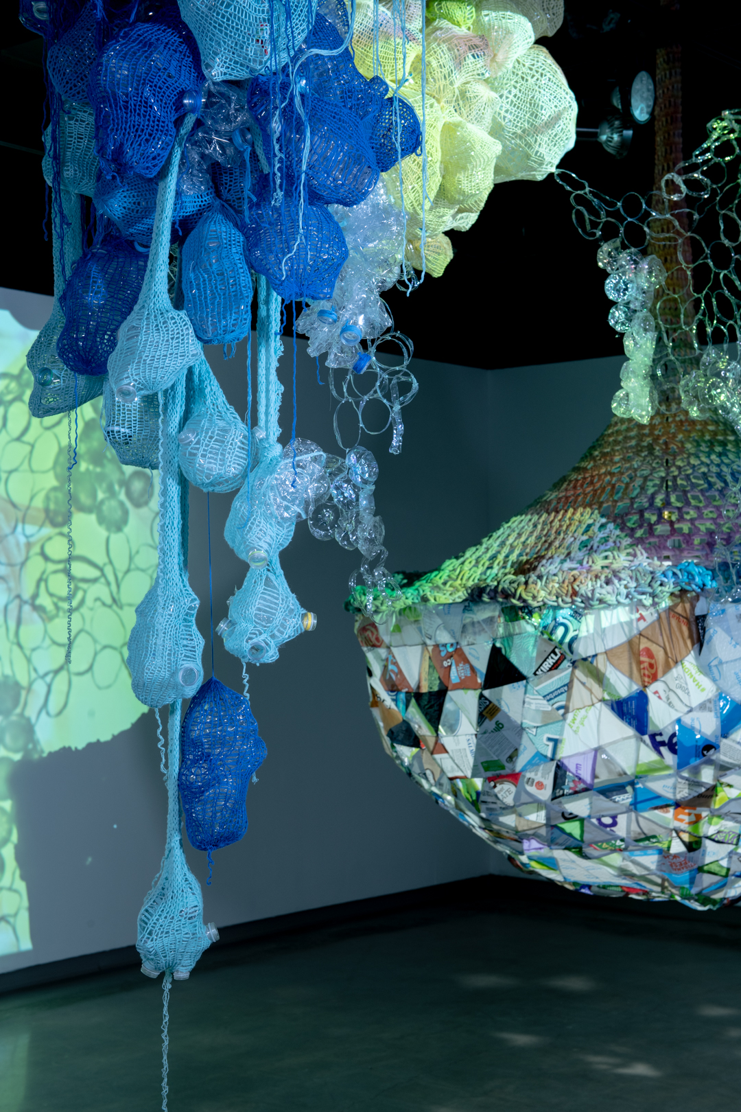 Image Statement: Vazelakis' artistic practice involves accumulating objects in her environment to document things left behind, giving them an alternative life as a record of her history and the consequences of the climate crisis. Her piece “Thirst” was inspired by the construction crews consuming and disposing of thousands of water bottles while rebuilding her home that was destroyed in the 2018 Woolsey Fire. To create this work, she collected hundreds of plastic water bottles left behind by the construction crews and knitted them with reclaimed yarn sourced from thrift store sweaters. Wire mesh was also used to create the structure of the piece. Through her use of repurposed materials, Vazelakis highlights the urgent need for sustainable practices and the impact of consumerism on the environment.