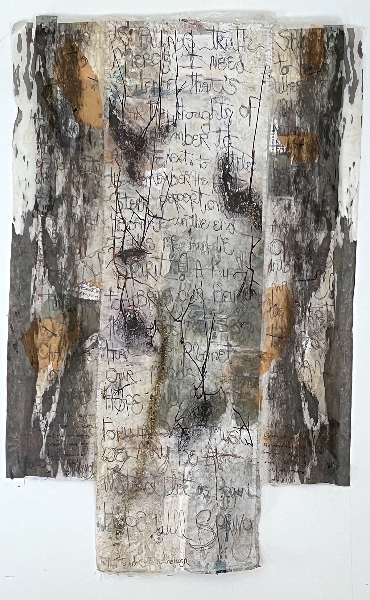 Materials: Artist printed digital silk organza, recycled papers, letters, and found materials, cheesecloth, satin varnish, mica medium.