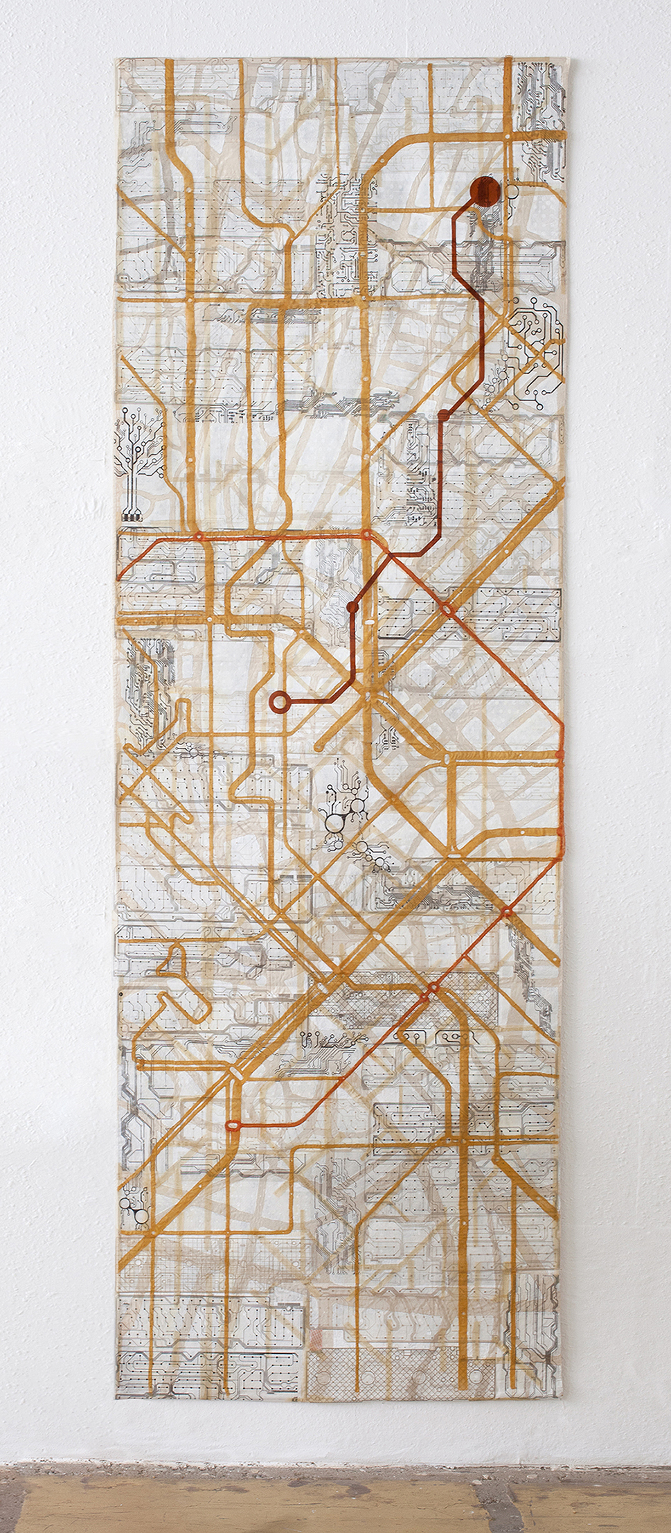 Image Statement: A city map is overlaid with integrated circuit films covered by a grid-like structure representing a map of public transportation system. The underground and circuit boards in computers, are ways to connect people, the former literally and the latter as an essential part of twenty first century living.
