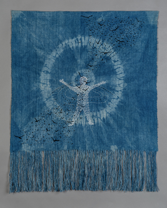 Image Statement: Linen, dyed with indigo, handwoven. Then stitched and dyed again with Indigo. Embroidered with cotton floss.