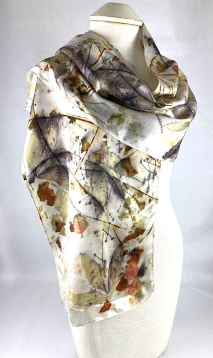 Image Statement: Eco printing always surprises me! Opening up silk that has been steamed for hours to reveal the results of what nature is capable of, is just like opening a special gift!