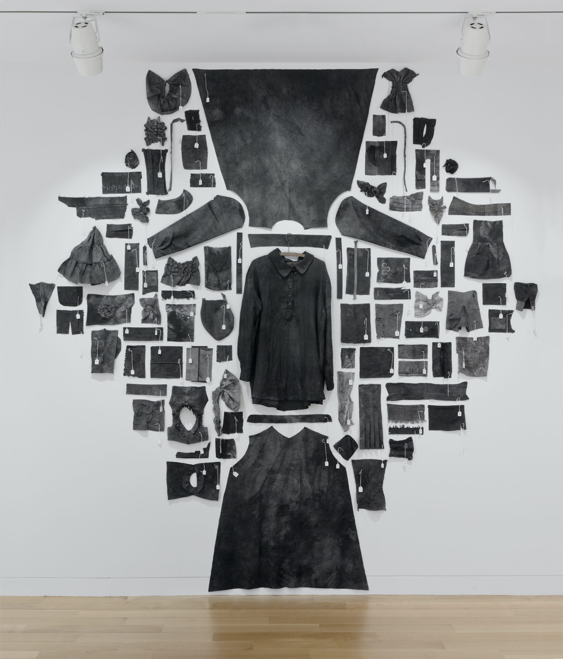 Image Statement: In my practice, I deconstruct and reconstruct clothing undoing another woman’s work and think about socioeconomics of maker/wearer and textile industry. In this installation, I used black painted fabric as I taught myself methods of fabric manipulation employed in garment construction to pay homage to the skills and craft of dressmakers. It is challenged learning, evidenced by my clumsy products, and labeled with tongue in cheek puns referring to the method and my emotions such as ‘I’m ruffled” for ruffles and “I’m boxed in” for a boxed pleat