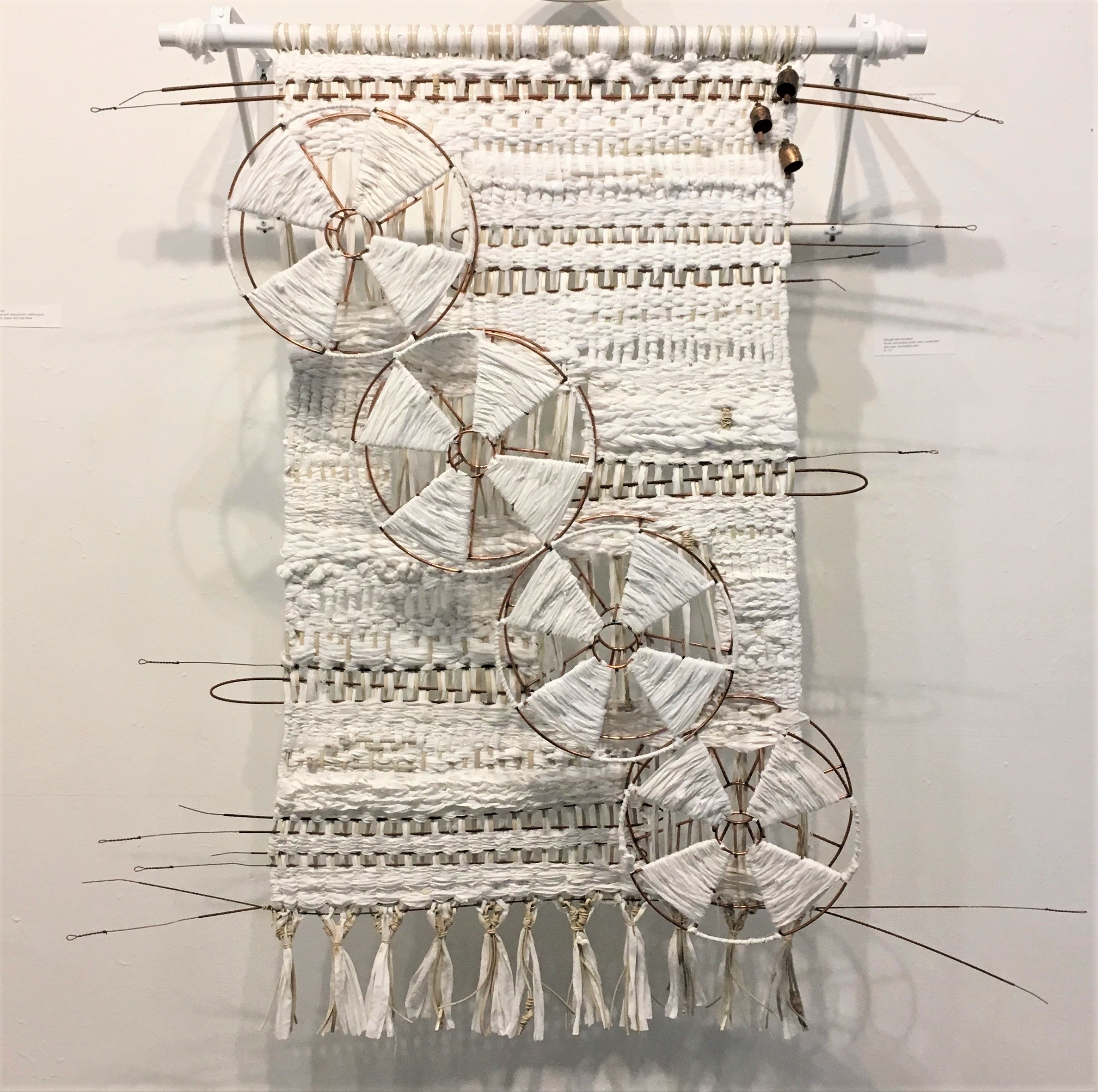 Materials: reclaimed fabric, piano wire, welding spools, coated wiring, and small bells