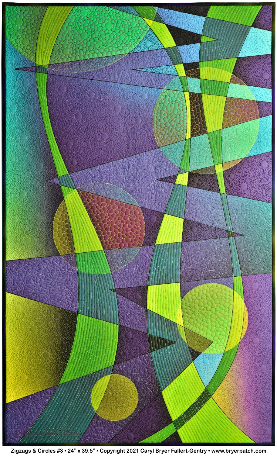 Image Statement: In my ongoing effort to simplify my work I decided to design a series of pieces that combined freeform zigzags, circles, and a few freeform curves. I drew the whole design in Corel Draw and had it printed by Spoonflower.com. I chose to limit my palette to cool colors, green, blue, purple, and a little chartreuse. As I arranged the shapes in the design, I made the areas where they overlapped into separate shapes and chose duller colors in those shapes to create the illusion that all the shapes are transparent. I quilted the black lines, and the lime green shapes with a regular sewing machine foot using heavy, #30 top-stitching thread. In the rest of the quilt, I used free-motion quilting with many different colors of thread and several different patterns, including circles combined with meanders, zigzags, and pebbles.