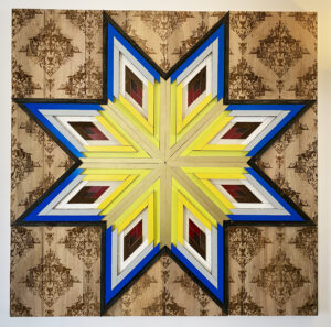 Troy Murrah, Cheetah Express, 2021. Mixed media, reclaimed materials, lone star quilt pattern, 53.25 x 53.25 inches. Photo by the artist.
