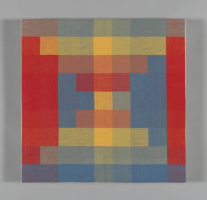 Ethel Stein, Red, Yellow, Blue, Green, Orange II, 1995. Cotton, satin damask weave, woven on a loom with a handmade drawloom attachment, 16 x 16 inches. Photo: The Art Institute of Chicago / Art Resource, NY.40.6 × 40.6 × 1.6 cm (16 × 16 × 5/8 in.). Gift of Ethel Stein (