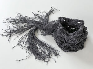 Adrienne Rogers, Linen Vessel, 2022. Handknit Japanese linen tape, 5 x 5 x 4 inches. Schweinfurth Art Center, Auburn, New York.
