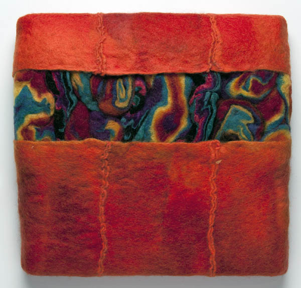 Sharron Parker (from Wake Forest, North Carolina) comments: This is the latest piece I’ve done in a series based on unpredictable patterns I get by layering many colors of dyed, unspun wool, felting them, and then combining slices with flat felts I’ve made. The possibilities are endless.