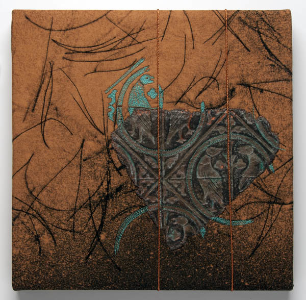 Constance Chapman (from Sechelt, British Columbia, Canada) comments: My work is often inspired by the materials themselves. For this show, I immediately wanted to connect cast paper to fabric with thread and metal. The small format size for this show initially seemed challenging, but once I started I worked quickly and intuitively and it was very freeing. Creating texture is always my goal. Inspiration and focus come from reading, my photographs and found objects.