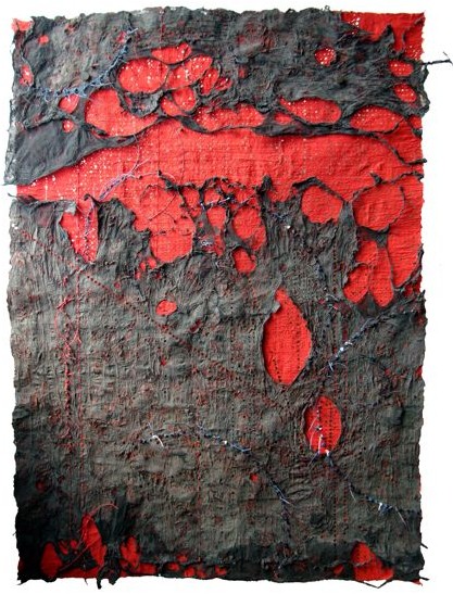 Joomchi is a 500-year-old Korean paper-making technique that uses water to seal several layers of thin, handmade mulberry papers together to form a single, strong sheet. Jiyoung Chung has brought her unique artistic sensibility to this established medium. Her colorful, richly-textured paper collages have an appealing cloth-like texture and read as poetic statements or narratives.