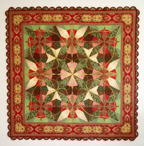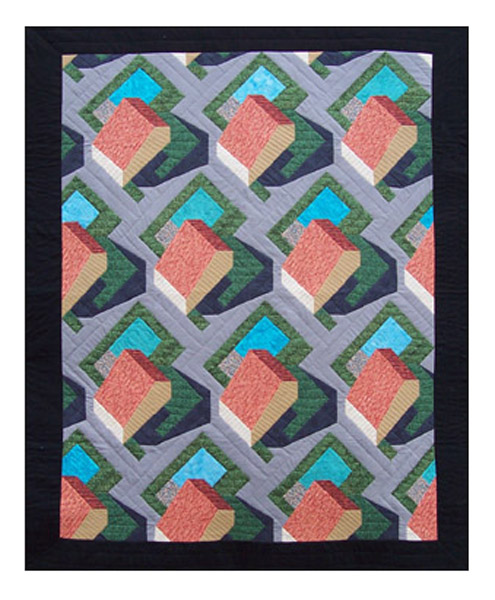 Next, let’s look at the work of Erick Wolfmeyer. His work rests solidly in the camp of “classical” piecing; the kind seen in quilting for the last several centuries. His approach is subtle, using a visual language that references both modern art and the use of quilts as wall art, yet he consciously makes his works with utility in mind. His colors are used to make 3-D shapes and give depth to the picture plane.