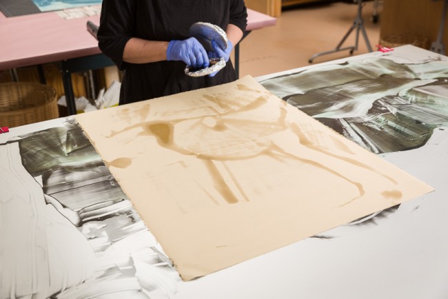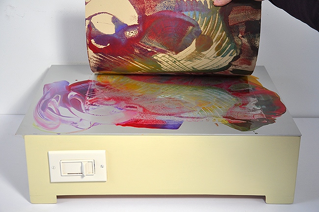 The process presents a double-edged sword, so to speak; one side being spontaneous, fun, intriguing, full of unplanned results that inspire new ideas – and the other a set of complex variables, including pigment-to-wax ratios, types and thickness of paper and variations in temperature that could quickly turn the print into a hot and waxy mess.