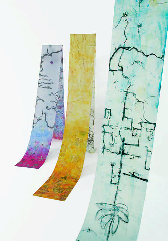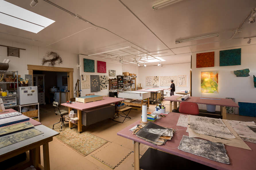 My early works included installations of 35-foot-long scrolls; heated encaustic and mixed-media drawings; multi-part print installations; translucent and multi-layered prints; and prints combined with encaustic paintings on panel. These pieces led to cut-paper installation works and path-breaking ways of exhibiting the works, including back-lit monotype installations and, most recently, video projection on a large-scale print image.