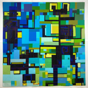 Susan J Lapham Jester 8: Hide and Seek 2020, commercial and hand-dyed cotton solids, improvisationally machine-pieced, long-arm quilted, 67″ x 68″. Photo by the artist.