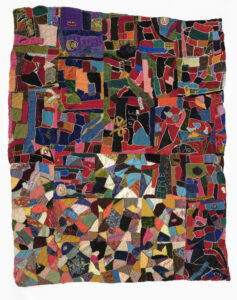 Rosie Lee Tompkins Untitled (crazy quilt) 1996 (quilted by Irene Bankhead, 1998), velvet, velveteen, cotton embroidery, silk, cotton corduroy, rayon brocade, printed silk, silk crepe with rhinestones, decorative trim, novelty patch, faux fur, beaded embroidery, cotton muslin backing, 96′′x 76′′. Eli Leon Bequest, Berkeley Art Museum and Pacific Film Archive.