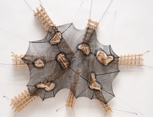 Kelman favors simple, malleable materials – like wood, wire and bamboo – and uses geometric logic to invent efficient construction methods. Onto these structures she integrate “skins” by crafting nets or by resist-dyeing white silk organza into elastic, translucent, woodgrain-patterned membranes. Many of the sculptures are tensile structures where the pliable membranes are tethered, stretched, and shaped through tension.
