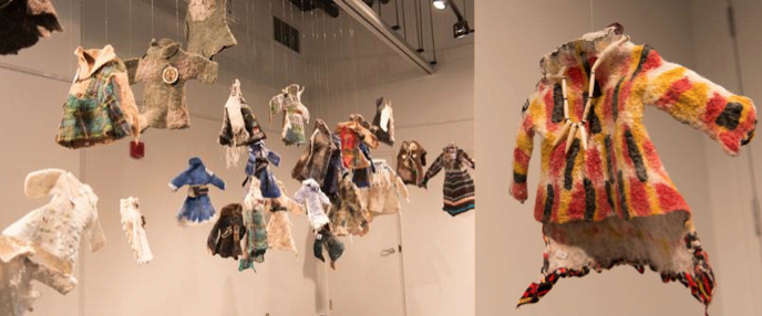 Upon arriving, I attended 2 openings of these solo shows at Art Image et Espace Odyssées in Maison de la culture in Gatineau. Passe moi toi; empreinte et movement showed French artist Françoise Carré‘s sculpture – constructed of discarded whole garments that are never cut. She created continuous horizons like landscapes on 3 walls and then floated 2 “figures” in the centre of the room. Her use of used clothing is clever and also poignant in its reconfiguration of both waists and wasted lives, perhaps rescued from obscurity? People aren’t present but the mass of humanity is, much like the piles of immigrant luggage in NYC’s Ellis Island Museum. Stories wanting to be told have been rendered silent by way of their disposal. Carré lets you search for and imagine them.