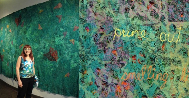 Susan Taber Avila (an SDA Board member) also works with discarded materials like end-of-roll textiles and thread rescued/recovered on its way to landfill. A Natural Phenomenon was an installation made of panels of laser-cut textiles in the shape of leaves caught in a web of machine stitches that intersect and join them. These layers hung suspended over a background cloth digitally printed with a garden wall overgrown with ivy. The top layer was embroidered with large text in pink thread which pops out enough to be read at a distance. Does her imagery suggest the individual struggling to be seen like a tree, a flower, a butterfly or leaf? Both these makers are story tellers skillfully using the media of fibre to invite the viewer to contemplate these lost narratives.