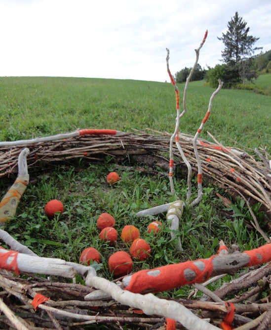 The event is built out from Moonrain Tapestry Centre in Val-des-Monts, Quebec. A few weeks prior to the official opening, 24 makers from across Canada, USA & Europe began working on outdoor installations on site. Some also had solo or 2-person shows in the larger lineup of exhibitions in municipal galleries throughout the region, along with other invited makers and an international touring exhibition.