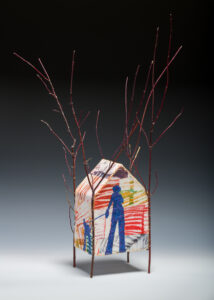 For my own part, once Covid-19 took hold I began to make 3D houses as a means for translating the wide scope of emotions and circumstances we suddenly faced. The iconic house form serves as an apt canvas for contemplating the commonality of sheltering-in-place, the diversity of challenges that presented themselves and varied ways of coping. Each house is faced with shibori-dyed silk and embroidery, typical of my 2D work. I incorporated branches foraged from my yard and woods to highlight the literal and figurative support nature provided, especially during those scary early months of isolation.