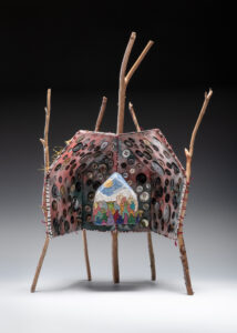 Elizabeth Fram, When We Emerge, 2021. Stitched-resist dyed raw silk, Peltex, embroidered and hand-stitched with silk, cotton and metallic thread, buttons, foraged branches, 21 x 12 x 10 inches. Photo: Paul Rogers.