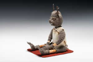 Leslie Roth embraced the full range of her lockdown experience, acknowledging the shift between intervals of turmoil and peace by channeling that duality into her practice. Many of her mixed media sculptures celebrate animal inhabitants of the woods and meadows surrounding her home in Vermont. Other pieces follow her imagination; she sculpts and knits fantastical creatures that are simultaneously humorous and subtly unnerving. Each real or imagined figure is made from foam board, canvas, wood, wire, and polymer clay paired with knitted hands, feet, and a head that brims with expression. Leslie freely and delightfully anthropomorphizes her creatures in an exploration of both emotion and narrative.