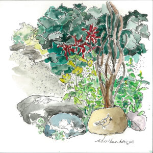 Many experienced changes in their art practice during the pandemic. Dianne Shullenberger took a conscious break from her usual textile collages yet, always true to her love of landscape, she began to create small ink drawings with watercolor washes, capturing quiet views during lock-down. Whether portraying vignettes of personal treasures within her studio, hidden corners of her garden during the warmer months, or the view through her studio window once everything was covered with snow, Dianne leaned on these paintings and her personal environment as a calming avenue toward joy and comfort in the face of uncertainty.