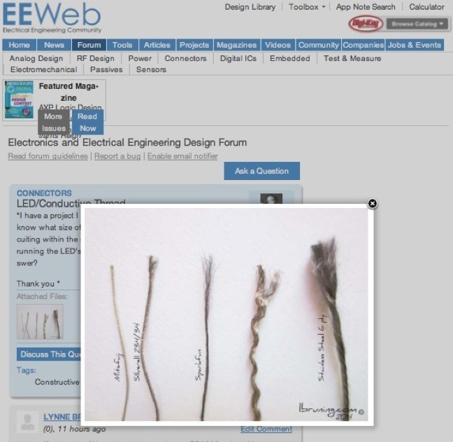 This frequently happens with my work, as with this EEWeb forum member posting a question about conductive thread and using my images as a reference, above.
