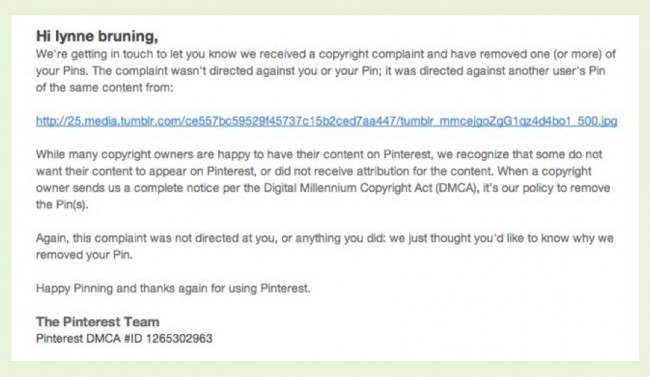 These examples demonstrate why it is imperative to watermark your images BEFORE sharing them with the global internet audience – or submitting them to museums, galleries, and competitions that publish, print or otherwise disseminate them. (Pinterest’s Terms of Service around pinning without attribution have evolved since the site began, as per notification below. Find out more about Digital Millennium Copyright Act referenced in the message here).